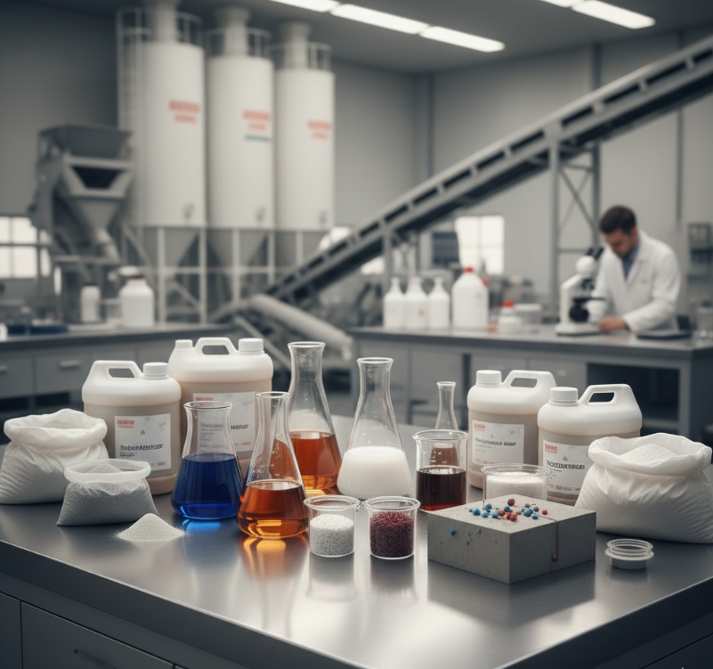 Polymer additives improve bonding, flexibility, and curing quality in specialised concrete mixes.