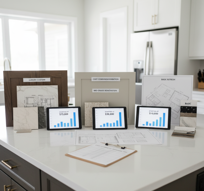• Countertops: Laminate ($20/sq ft) vs. Quartz/Granite ($70–$150/sq ft)