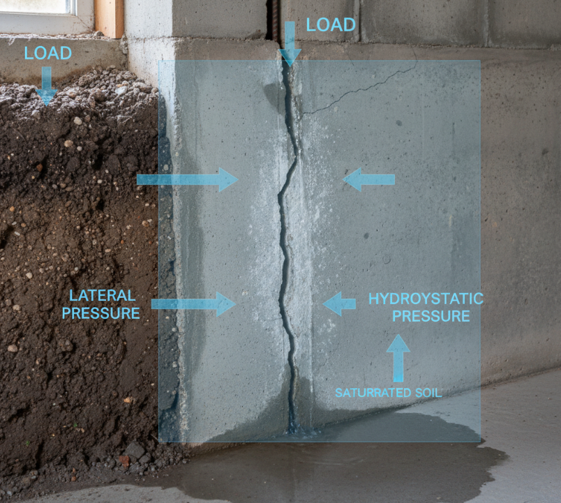 • Hydrostatic pressure: Water buildup around the foundation creates pressure.