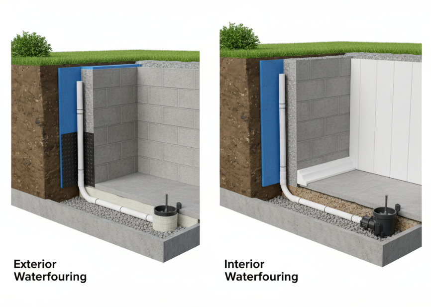 Water can enter basements through cracks, porous walls, or pressure buildup in the soil outside. The goal of waterproofing is to block or redirect this water before it causes harm. There are two main approaches to achieve this: interior and exterior waterproofing.